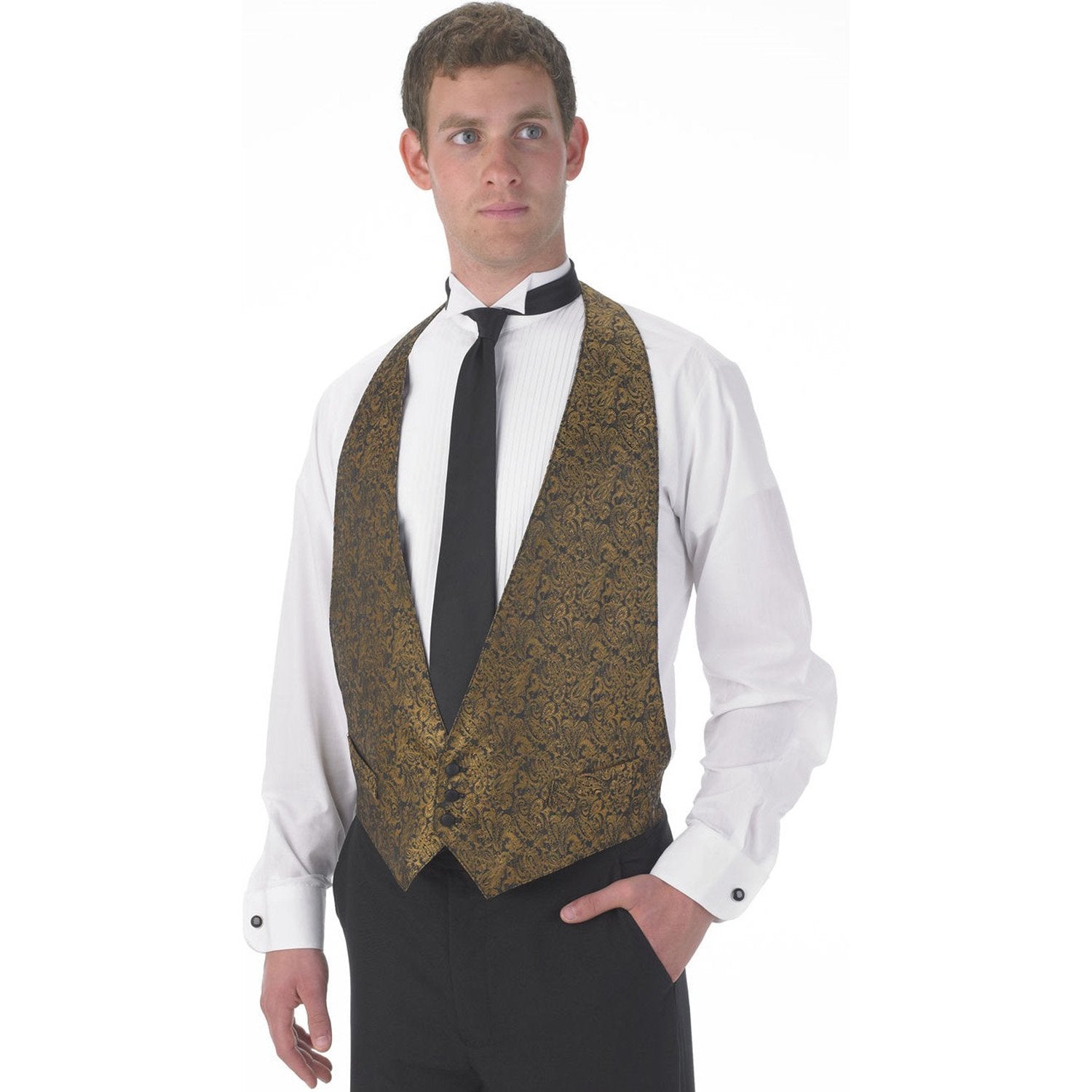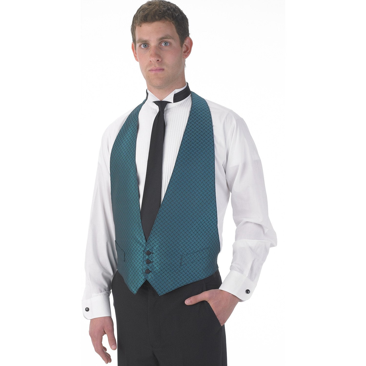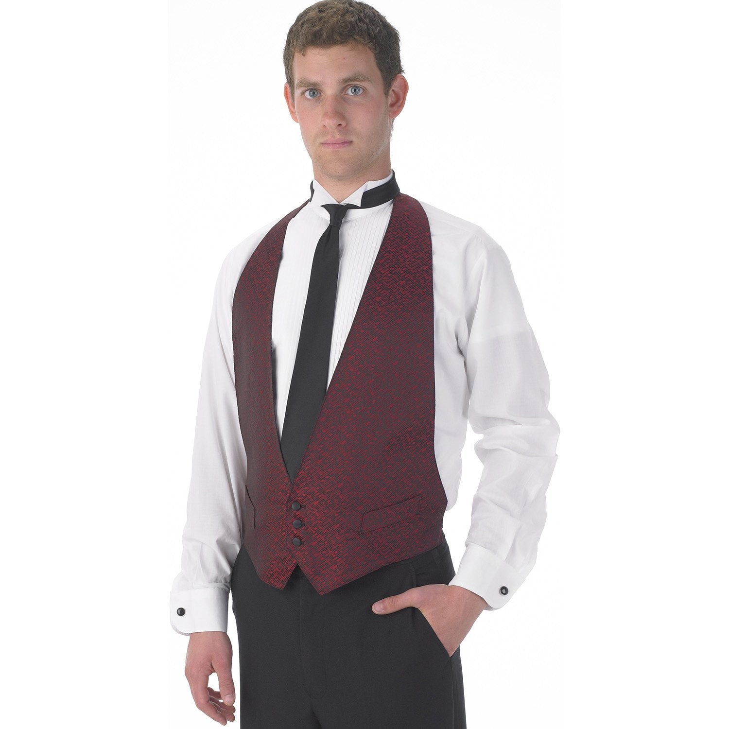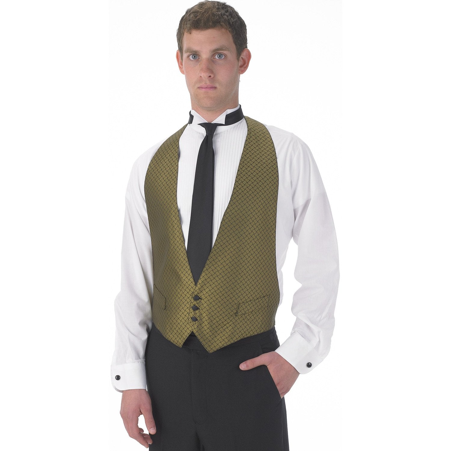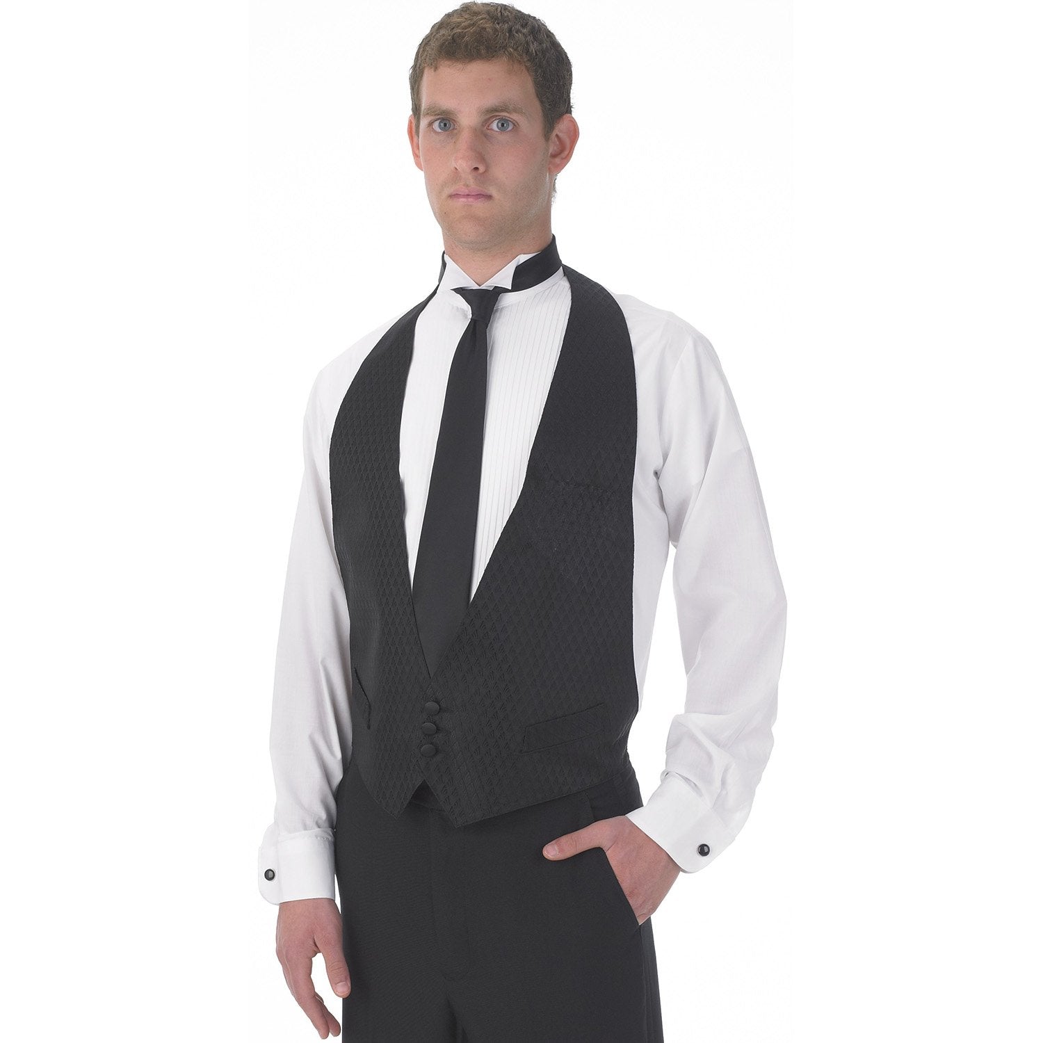Backless Vest. Has adjustable velcro neck closure and adjustable elastic back strap and buckle. Fully lined with two "dummy" welt pockets, three-button front, and machine washable. 100% Polyester