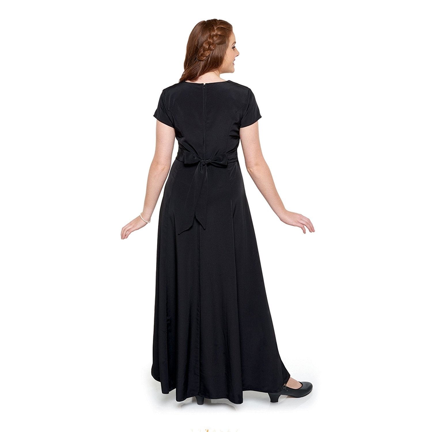 Short sleeve sweetheart neckline, floor length gown with princess seams. Classic 100% Polyester Peach Skin Fabric. Tie backs and back zipper. Machine washable.
