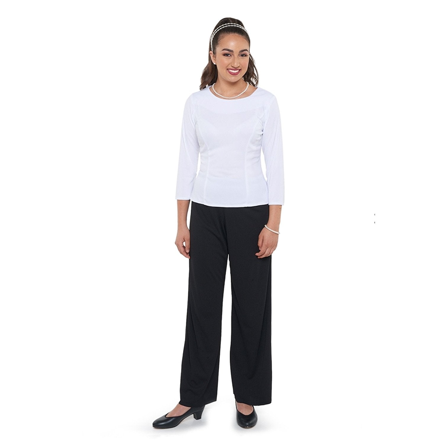 100% Polyester Stretch Knit. Elastic waist with extra fullness in pant legs for movement. Machine washable.