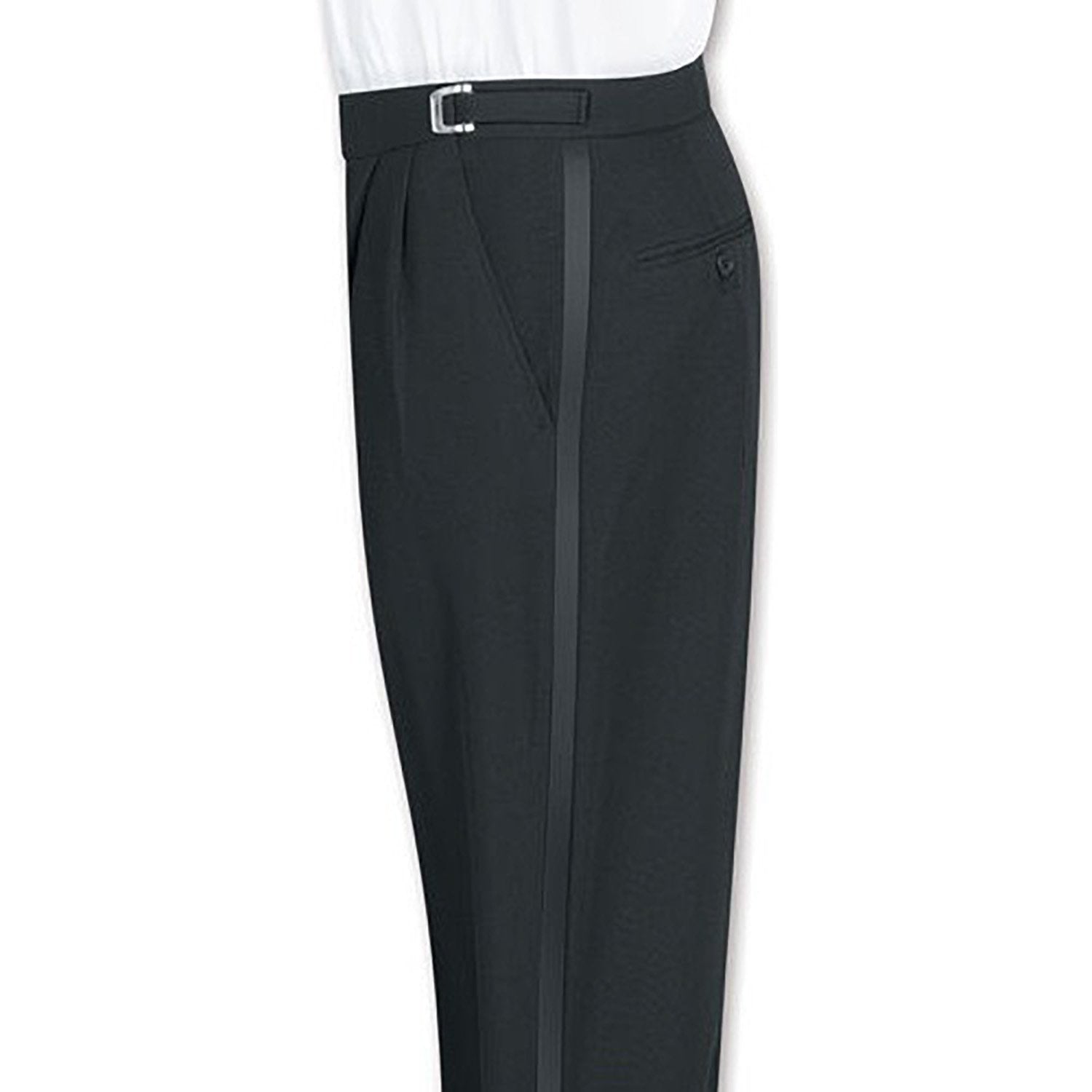 100% polyester, adjustable waist, double pleated front with satin side stripe. Two quarter-top pockets and two back pockets.