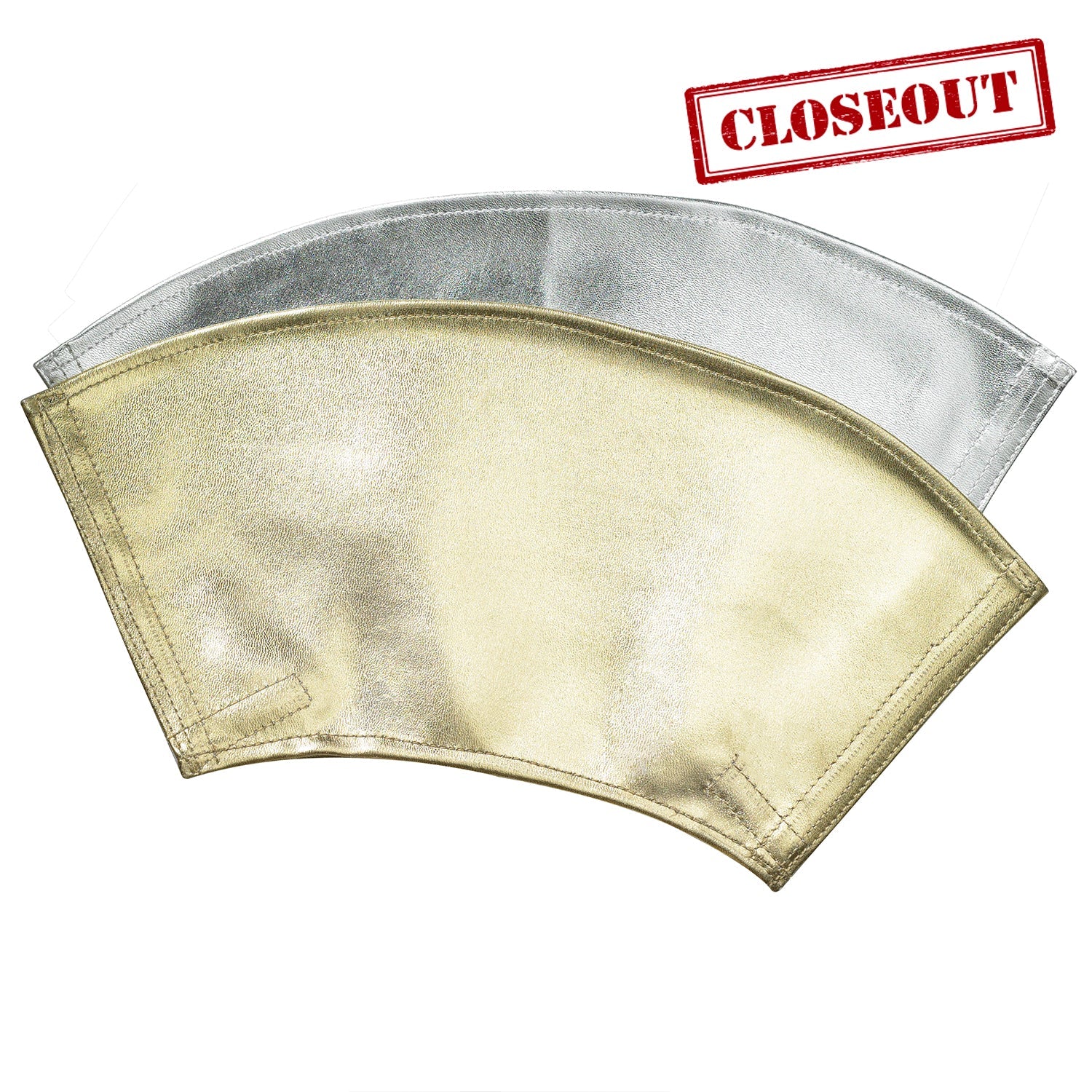 Our closeout in-stock gauntlets are available in Silver or Gold Vinyl, and come in two sizes, regular (a one size fits most) 9" arm length and a Drummer size, 6 1/2" length (Micro). Our Gauntlets feature an "L" shaped Hook and Loop closure to ensure best fit. They are also designed in a conical shape to have the most desirable appearance.