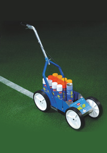 10" wheels elevate the carriage to provide an even ride over rough or uneven surfaces. Ideal for grass, dirt, gravel or any uneven surface. Engineered and designed for easy operation and durability. 18 gauge steel construction. Stripe widths of 2" to 4". 12 can storage on unit helps you get done faster.